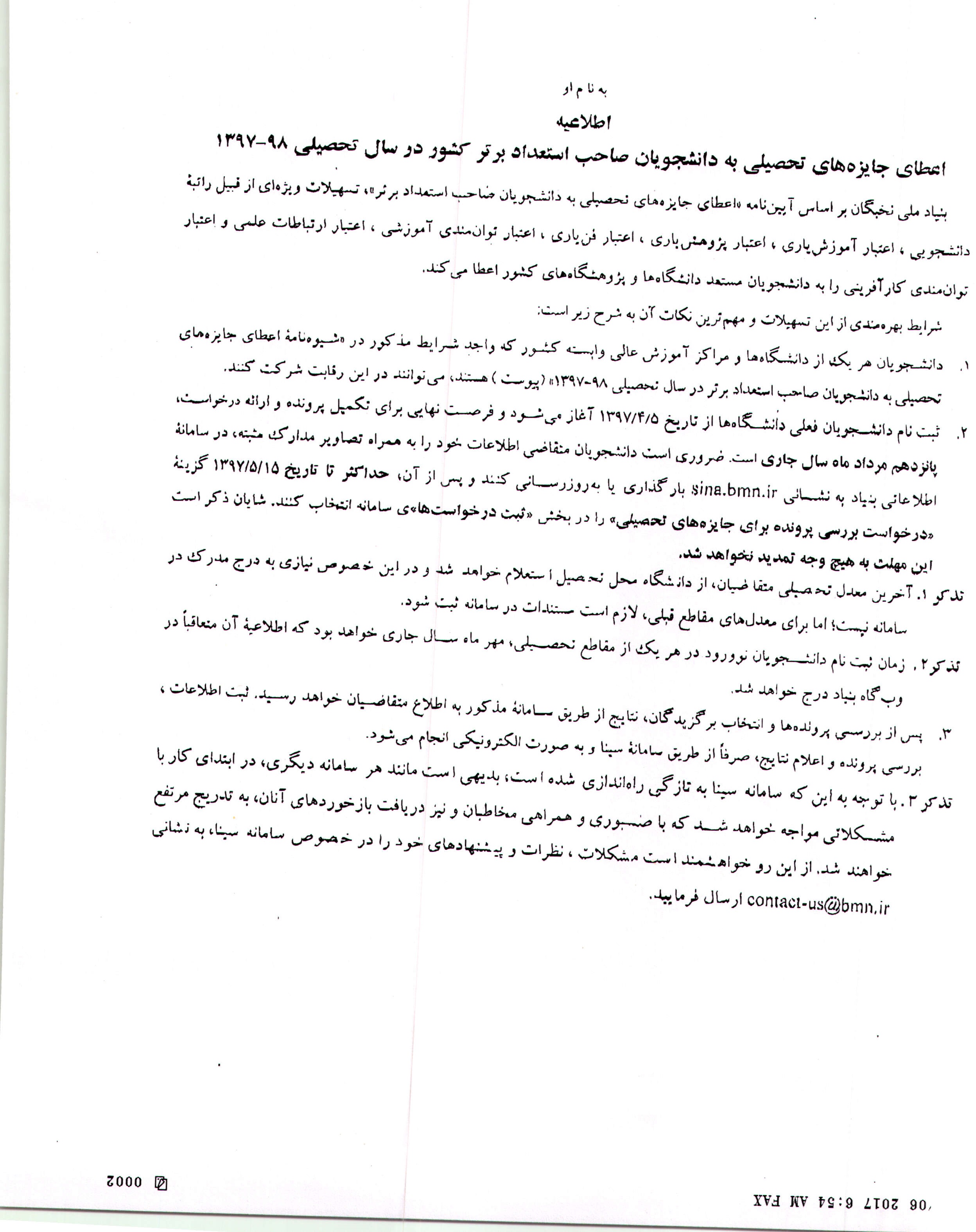 دانشجویان می توانند از تاریخ 97/04/05 لغایت 97/04/15 با مراجعه به پایگاه اطلاعاتی بنیاد ملی نخبگان به نشانی sina.bmn.ir در خواست های خود را برای بهره مندی از این تسهیلات بارگزاری نمایند.