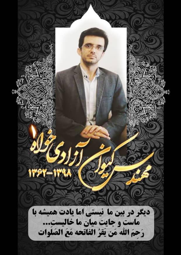 با کمال تاسف و تاثر عروج عارفانه همکار عزیز، وارسته و دلسوز؛ اقای مهندس کیوان ازادی خواه را به خانواده بزرگوار ایشان و جامعه دانشگاه فرهنگیان استان فارس تسلیت عرض نموده، برای آن عزیز سفر کرده مغفرت و رحمت واسعه الهی و برای خانواده و بازماندگان وی صبر و اجر از خداوند متعال مسالت می نماییم.