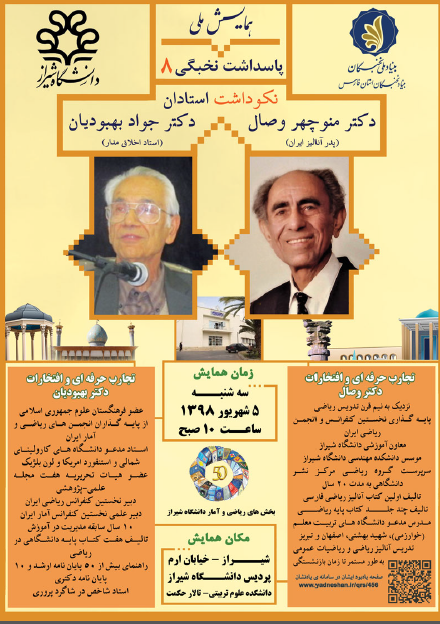 مراسم نکوداشت پروفسور جواد بهبودیان و زنده یاد دکتر منوچهر وصال شیرازی از اساتید برجسته کشور همزمان با پنجاهمین کنفرانس ریاضی ایران در دانشگاه شیراز برگزار می شود.
