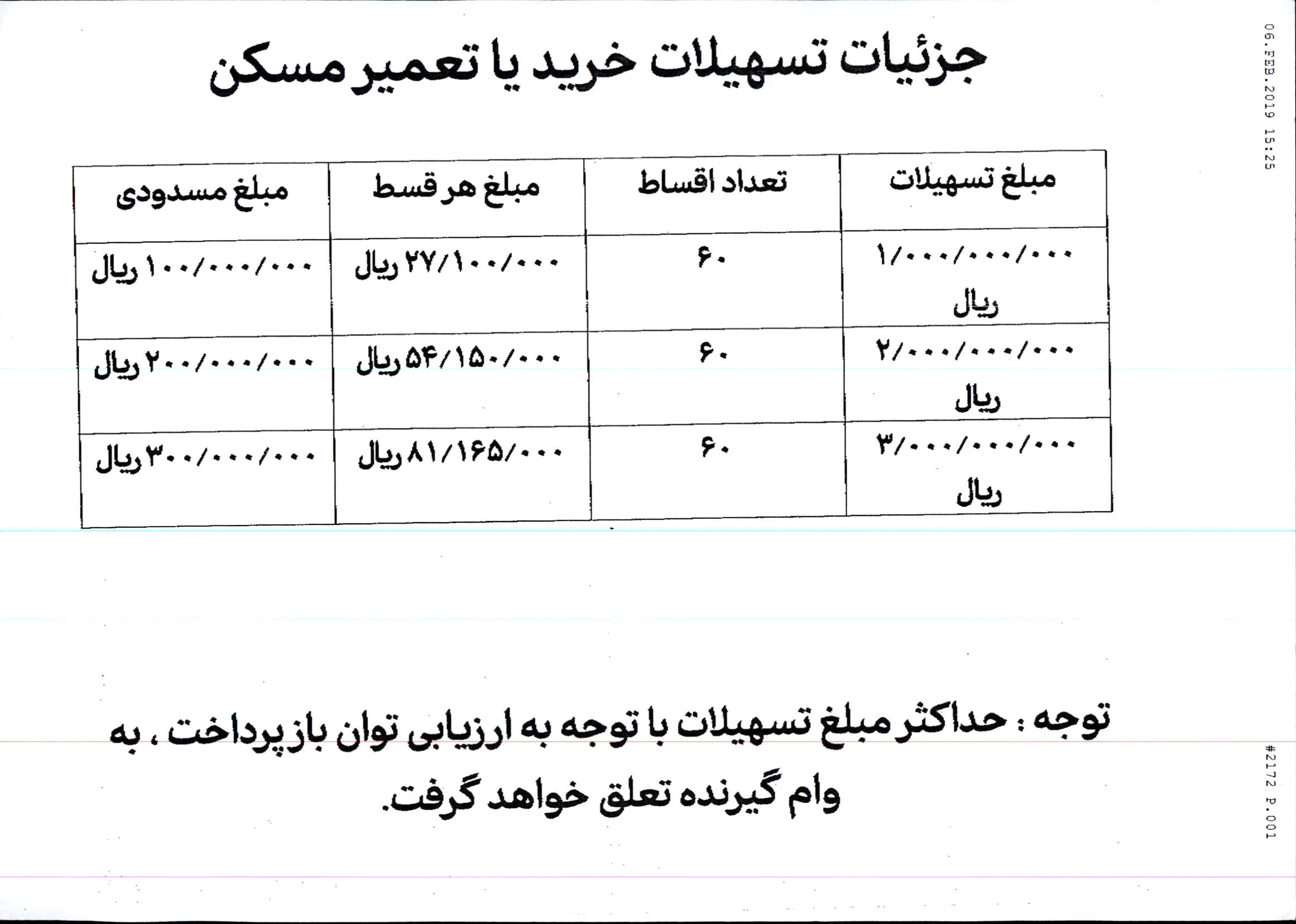 تا سقف سه میلیارد ریال بابت خرید املاک مسکونی واقع در شهرهای تهران، مشهد، تبریز، اصفهان، کرج، شیراز، اهواز، ارومیه و رشت |