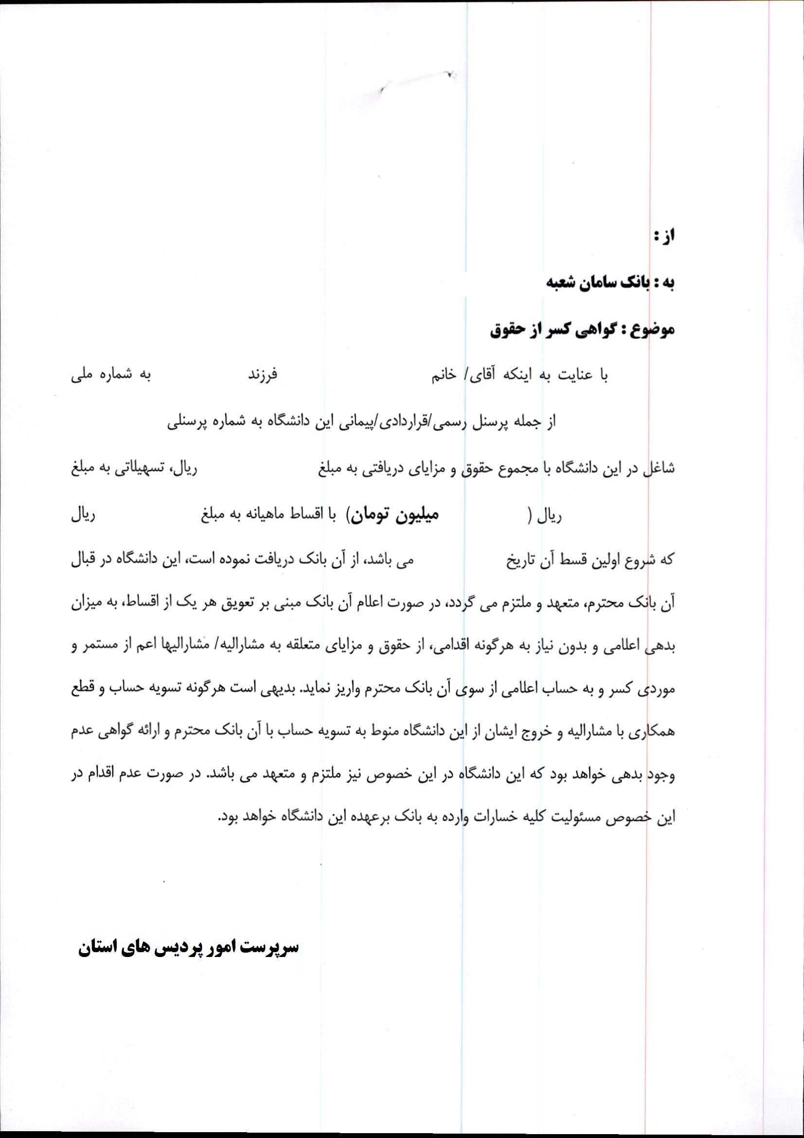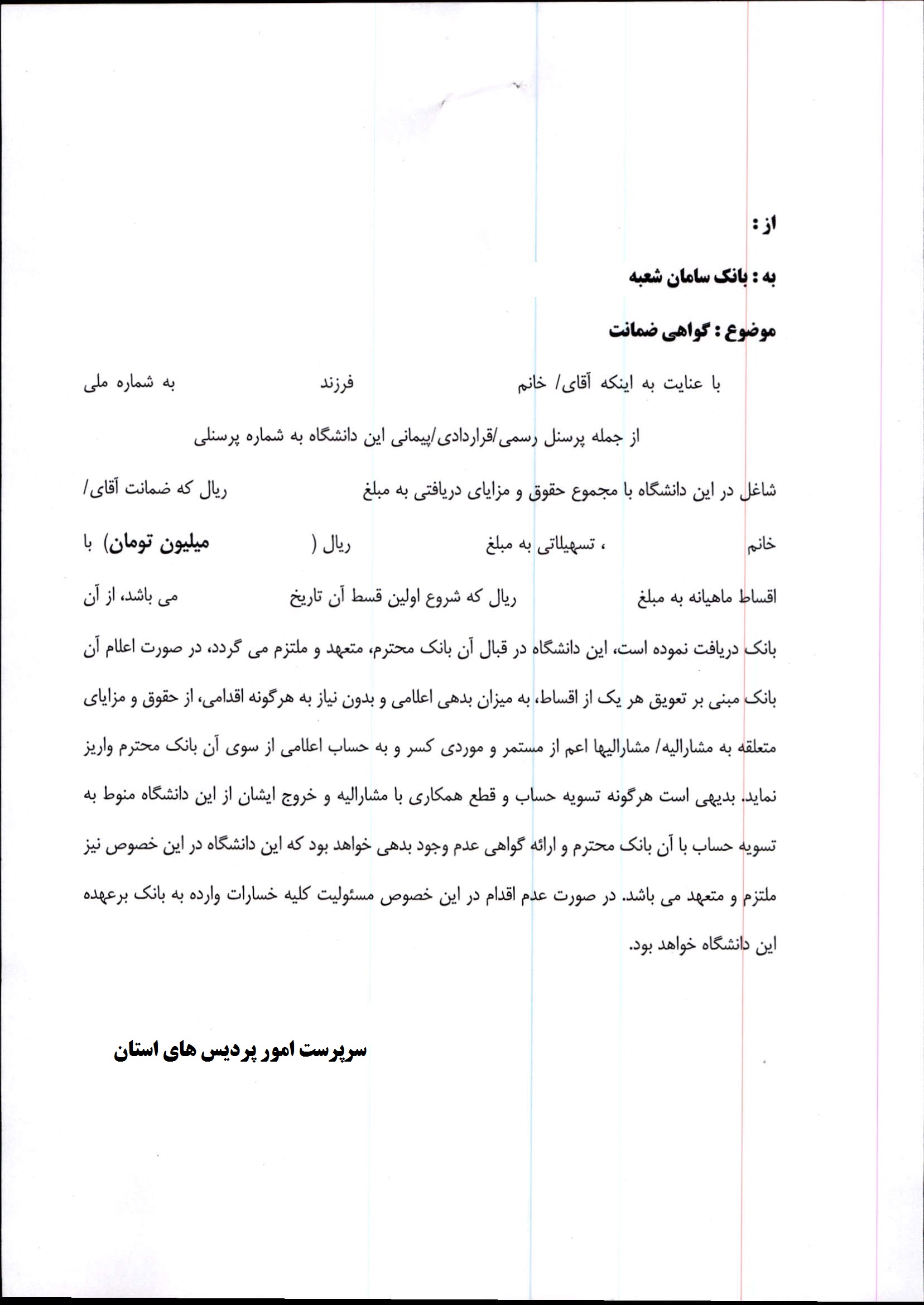 10% وثیقه درجه یک نوع اول + چک + گواهی کسر قسط برای اعضای هیأت علمی |