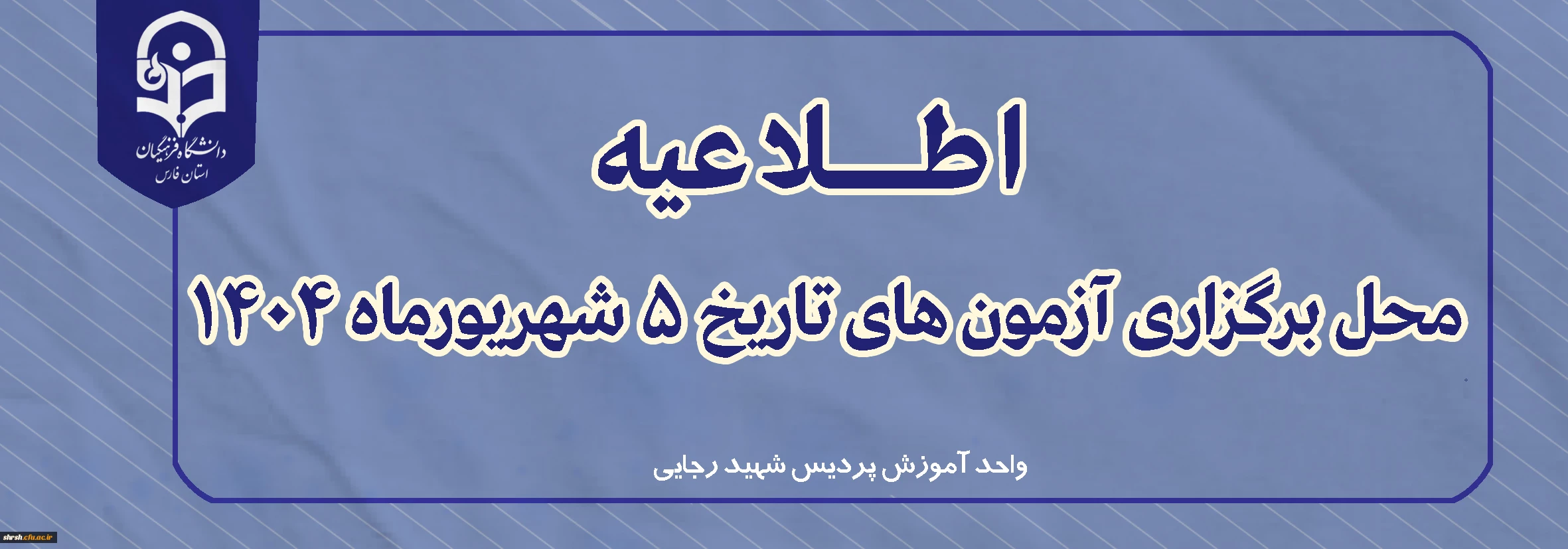 محل برگزاری آزمون های تاریخ 5 شهریورماه 1404 در کارت ورود به جلسه نیامده است، دانشجویان جهت اطلاع از مکان و شماره صندلی آزمون پاین ترم 4032 مورخ 1404/06/05 پردیس شهید رجایی فارس (رجایی، سلیمانی، لار) به فایل زیر مراجعه نمایند.