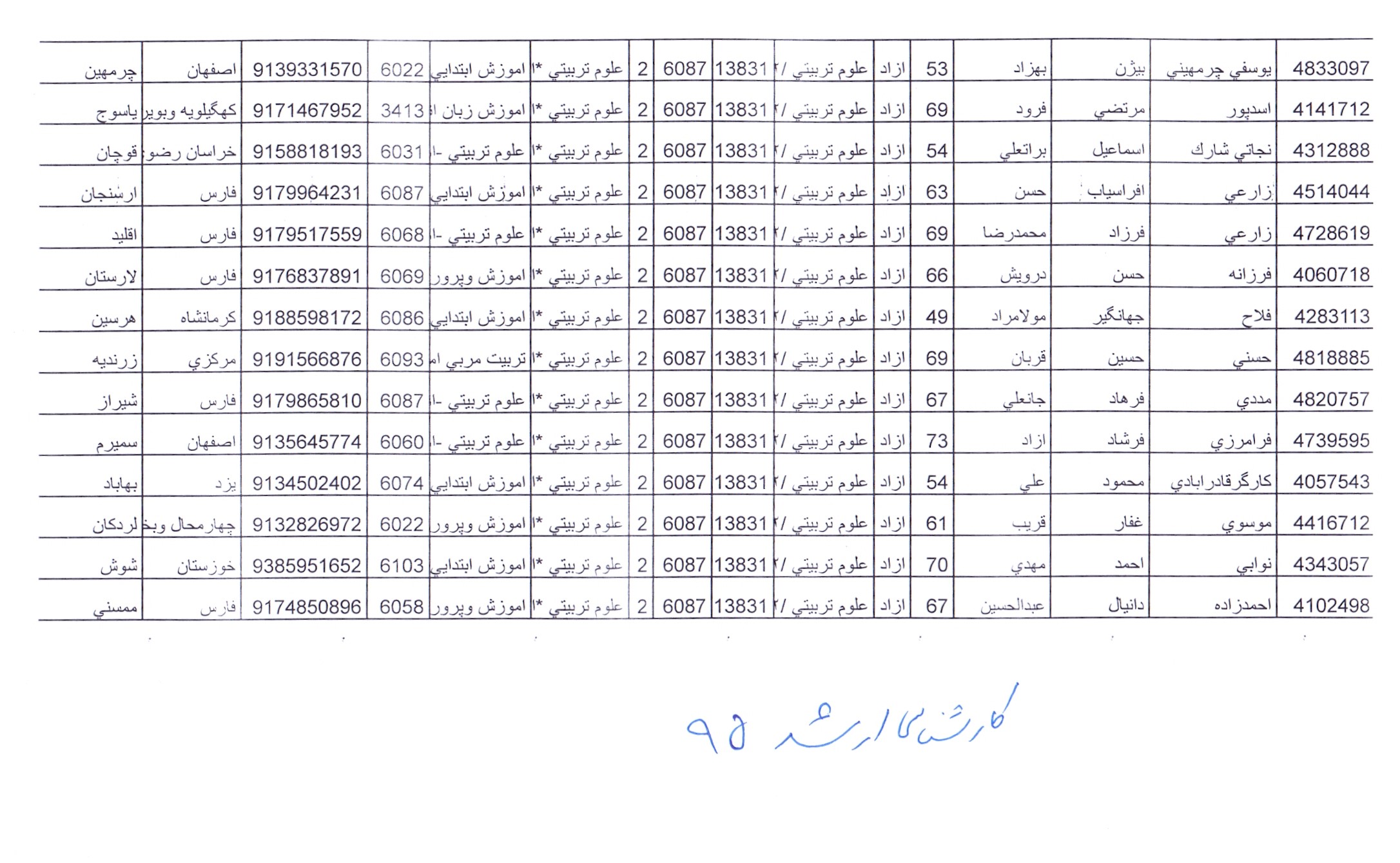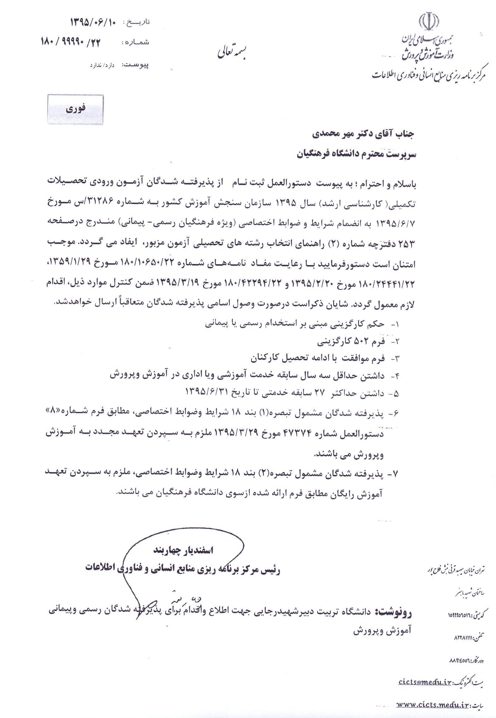 6- پذیرفته شدگاه مشمول تبصره (1) بند 18 شرایط و ضوابط اختصاصی، مطابق فرم شماره (8) درستورالعمل شماره 47374 مورخ 29 خرداد 1395 ملزم به سپردن تعهد مجدد به آموزش و پرورش می باشند.