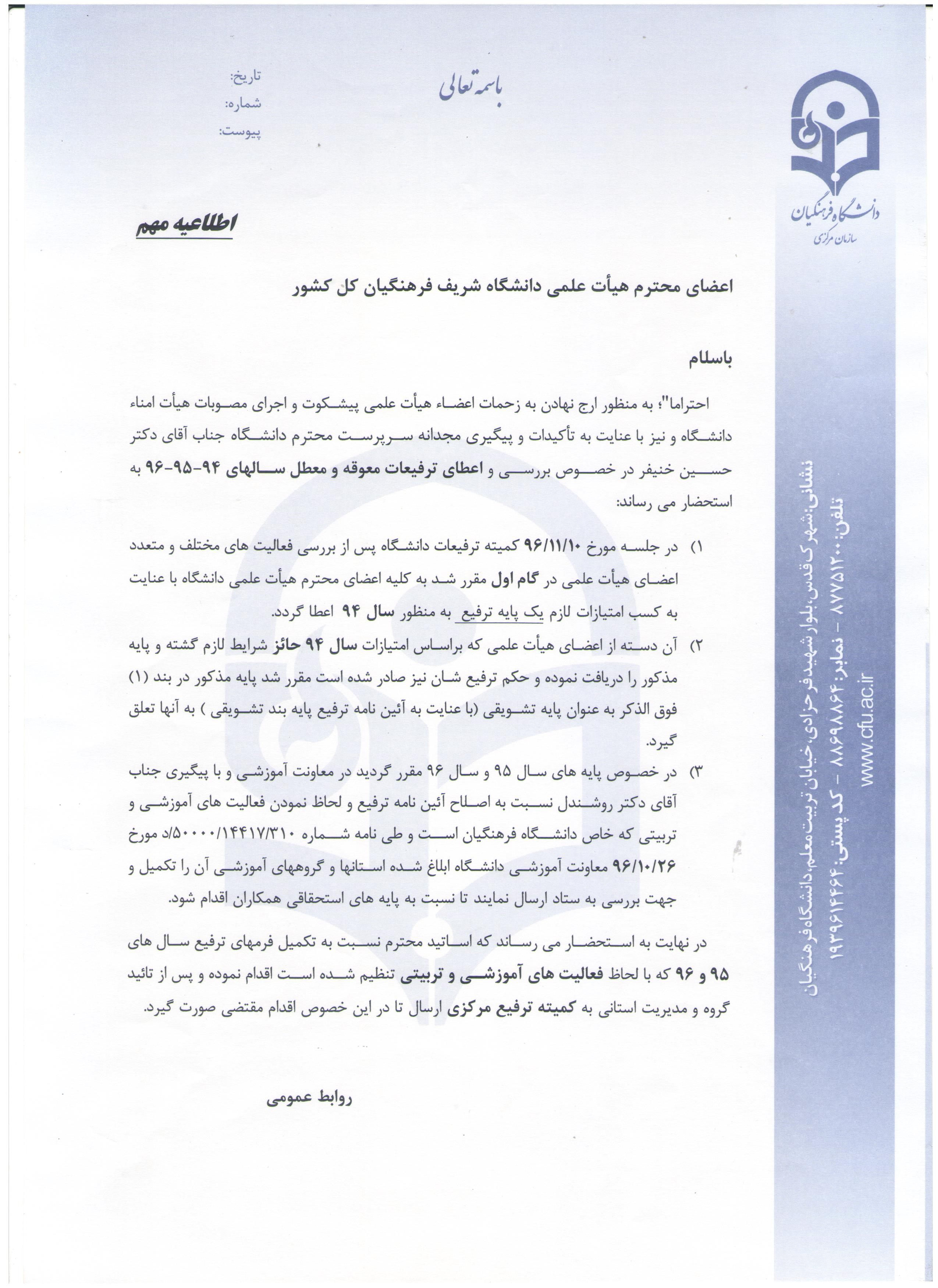 به منظور ارج نهادن به زحمات اعضاء هیأت علمی پیشکوت و اجرای مصوبات هیأت امناء دانشگاه و نیز با عنایت به تأکیدات و پیگیری مجدانه سرپرست محترم دانشگاه جناب آقای دکتر حسین خنیفر در خصوص بررسی و اعطای ترفیعات معوقه و معطل سالهای 94-95-96 مطالبی به شرح پیوست اعلام شد: