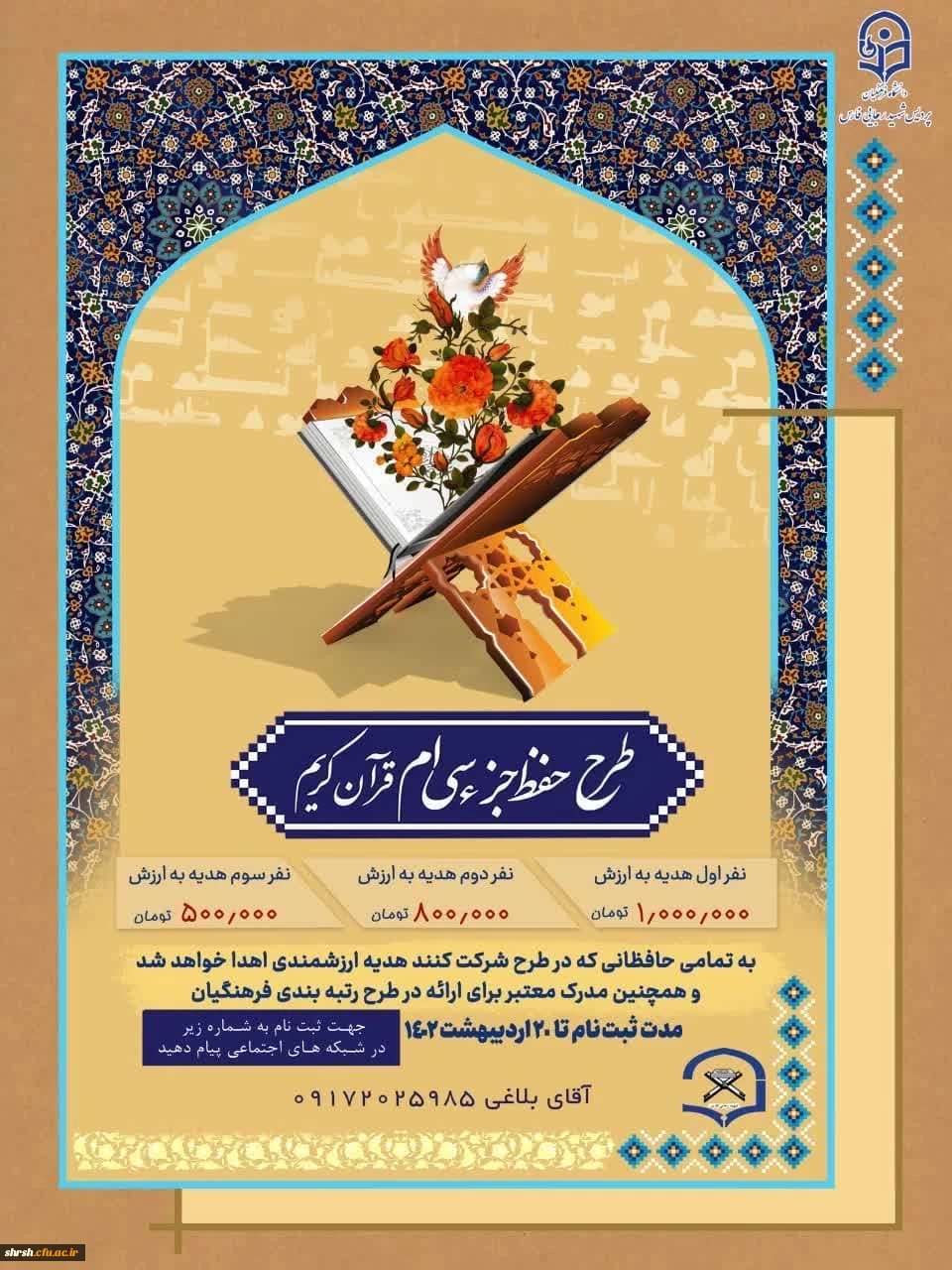 همچنین به تمام حافظانی که در طرح شرکت کنند هدیه ارزشمند و مدرک معتبر اهدا خواهد شد.